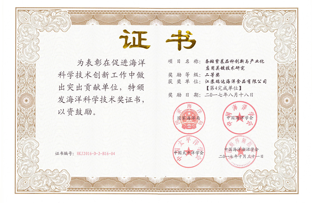 近日,我司全資子公司瑞達(dá)海洋食品有限公司參與的“條斑紫菜品種創(chuàng)新與產(chǎn)業(yè)化應(yīng)用關(guān)鍵技術(shù)研究”項(xiàng)目,榮獲國(guó)家海洋科技二等獎(jiǎng)。此項(xiàng)目提高了條斑紫菜品質(zhì)、推動(dòng)了產(chǎn)業(yè)科技化發(fā)展,引發(fā)業(yè)界廣泛關(guān)注。